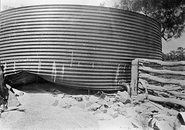Flood damage to a large water tank on 'Portland Downs' station.