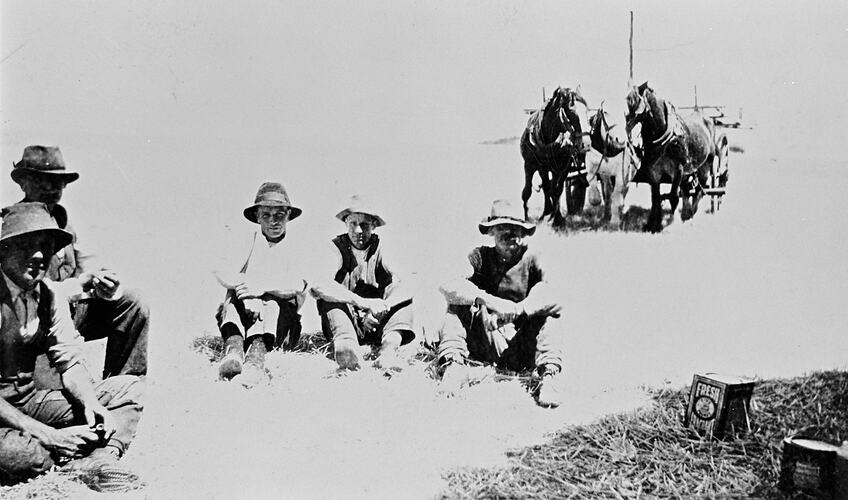 Five men taking a work break, sitting on the ground. There is a horse team in the background.