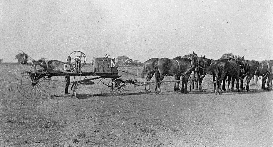 Horses drawing equipment used for creating fire breaks on 'Portland Downs' station.