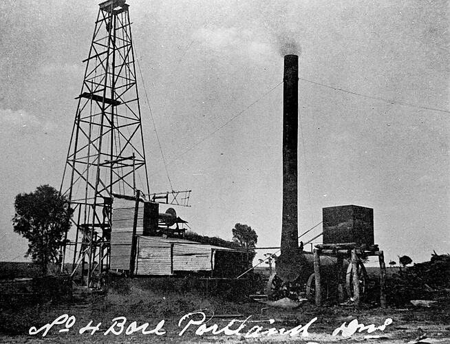 No.4 artesian bore on 'Portland Downs' station. The steam engine on the right has an extremely tall funnel.