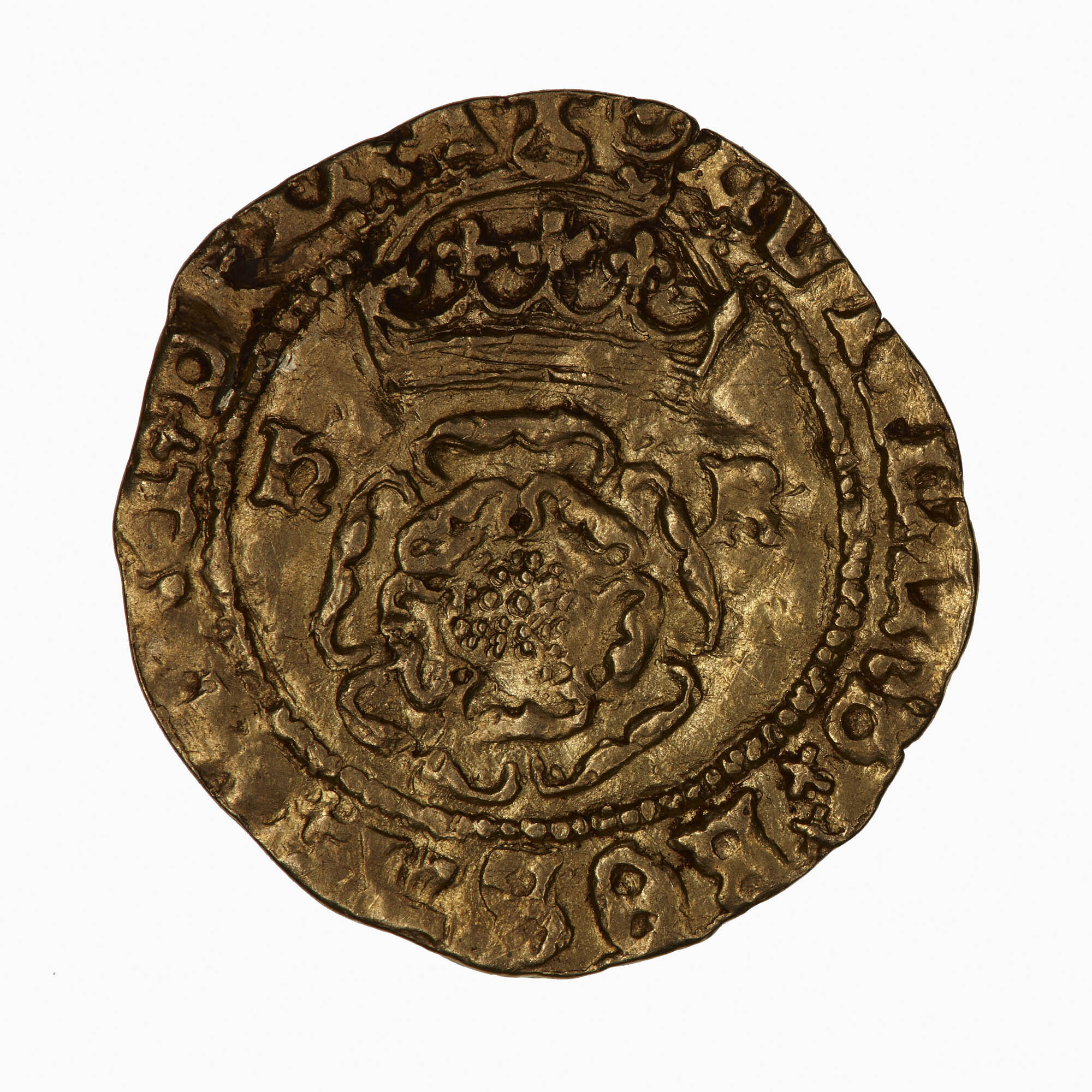 Crowned rose dividing the letters HR; around, (mm pellet in annulet) RVTILANS ROSA [SIN]E SPINA (translation: a dazzling rose without a thorn).