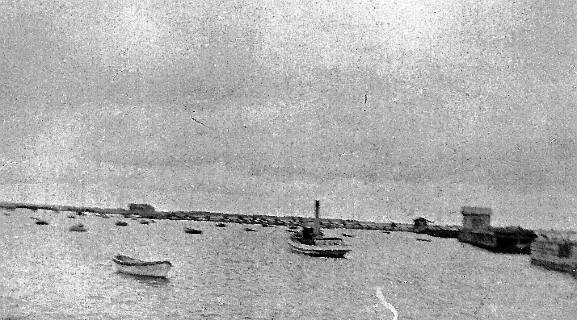 A harbour scene with boats and a jetty.