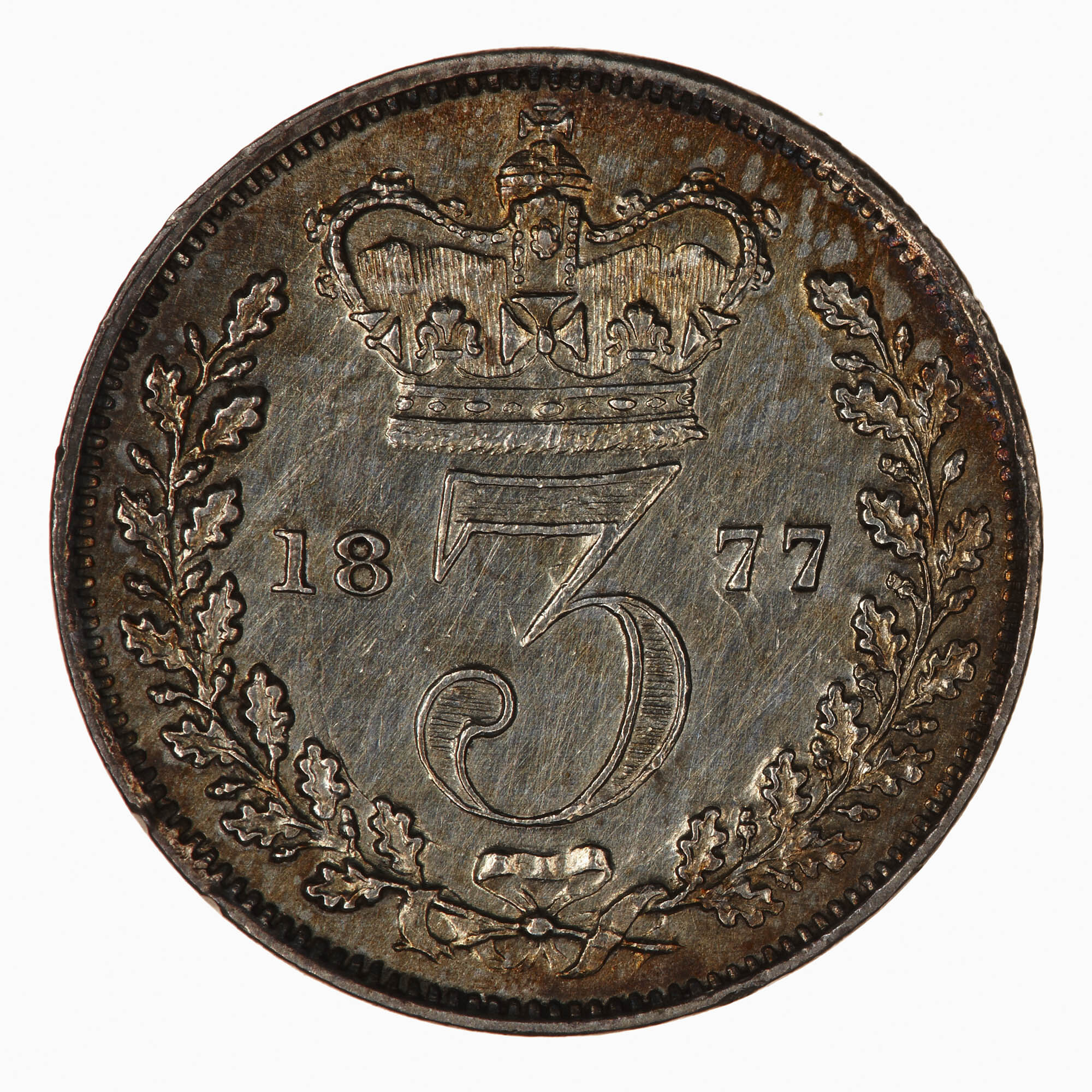 Within an open oak wreath and below a crown, the numeral 3 dividing the date 1877 (clashed dies)