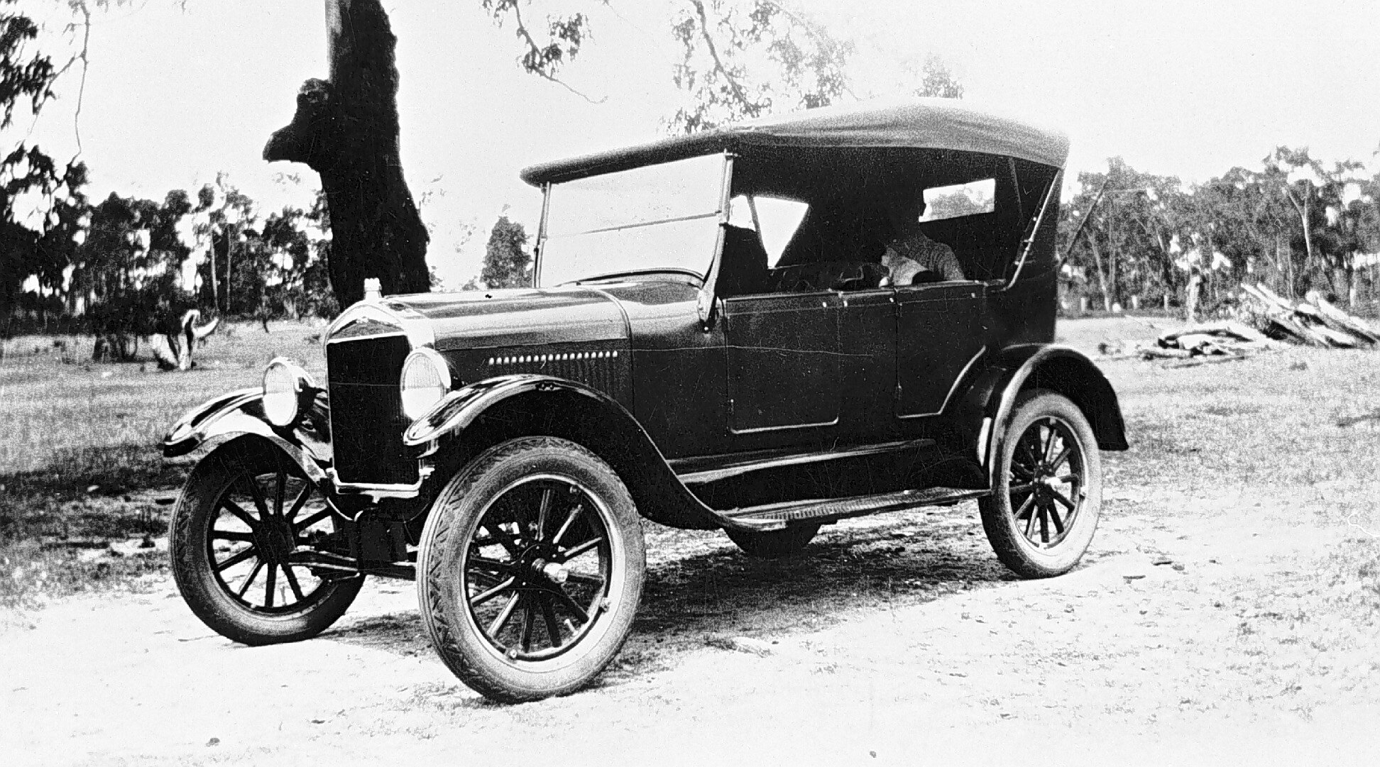 A Model T Ford motor car with a woman seated in the back seat.