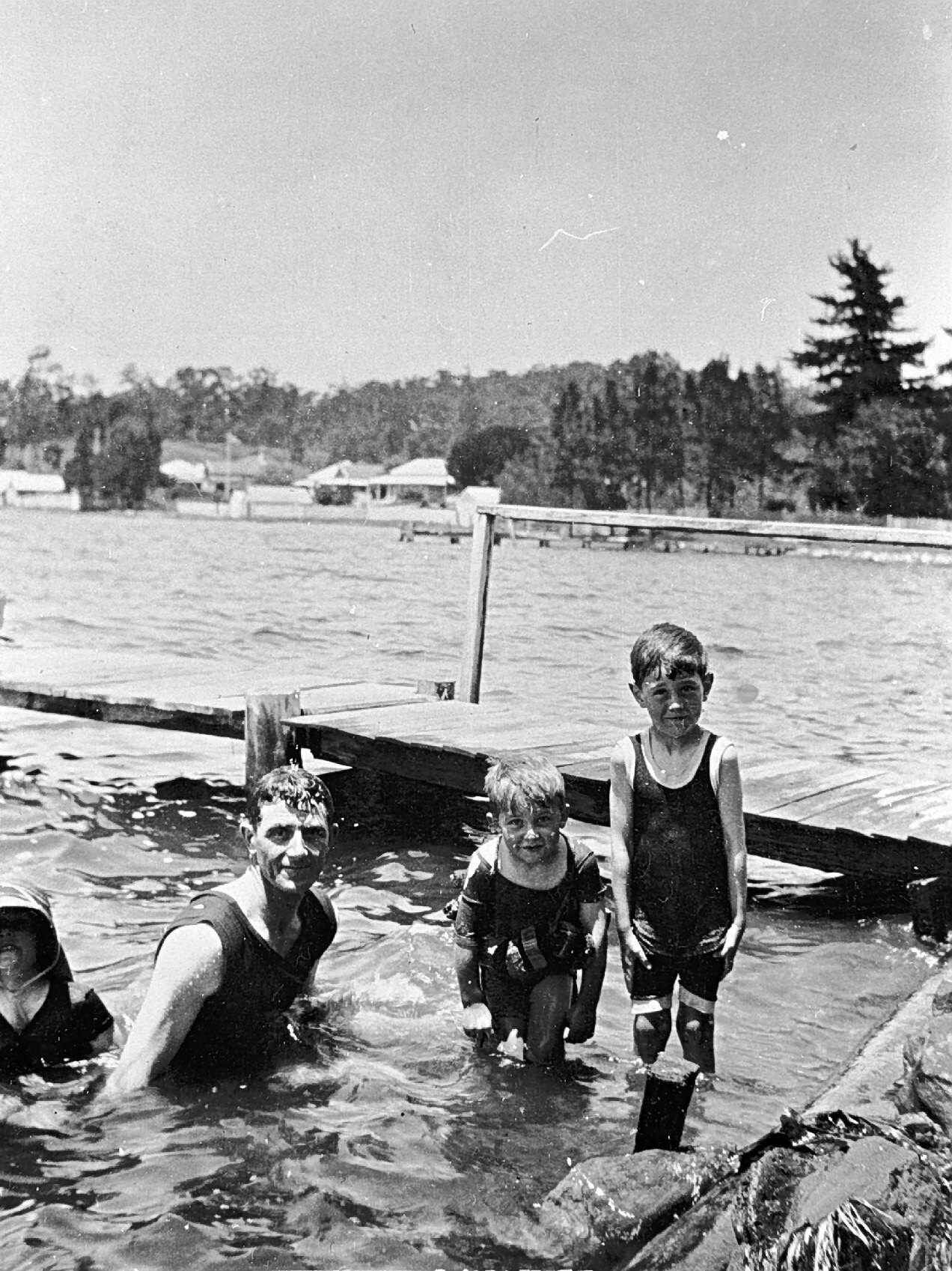 A man and boys swimming at Lake Macquarie.