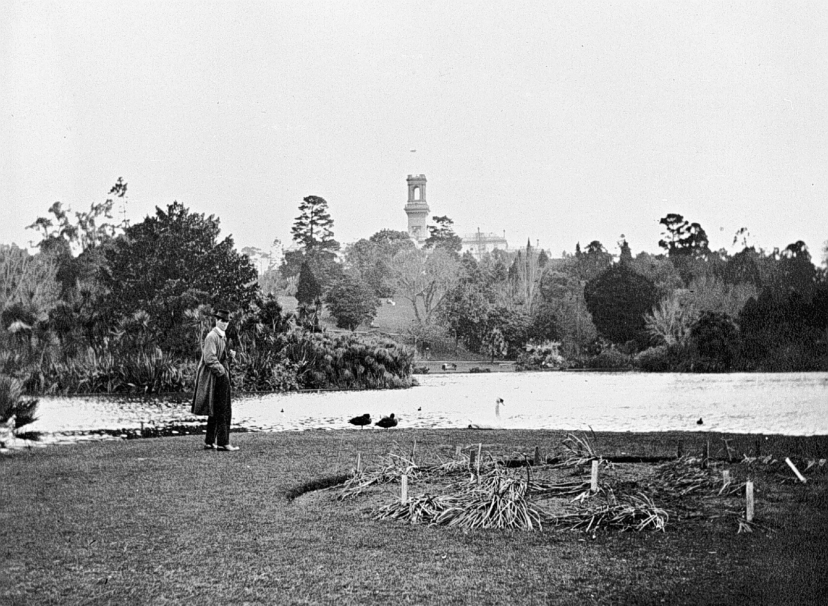 A man standing by the lake in the Melbourne Botanic Gardens. Government House in the background.