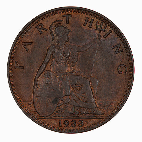 Britannia seated facing right on a rock wearing a helmet and flowing robes; she holds a trident and rests her right hand on a shield which bears the combined crosses of the Union Flag; around above, FARTHING; in exergue, 1933