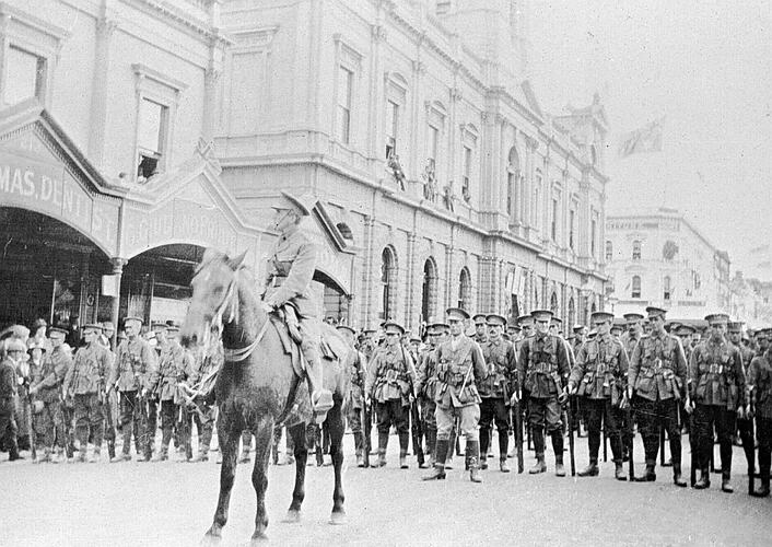 An officer at the head of soldiers of the 39th Battalion. They are outside the Ballarat Town Hall.