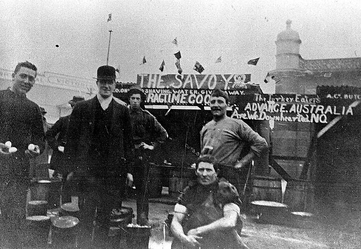 Cooks at the army camp. Signs on the structure in the background read: 'The Savoy','Shaving water given away','Ragtime cook' and 'Advance Australia'.