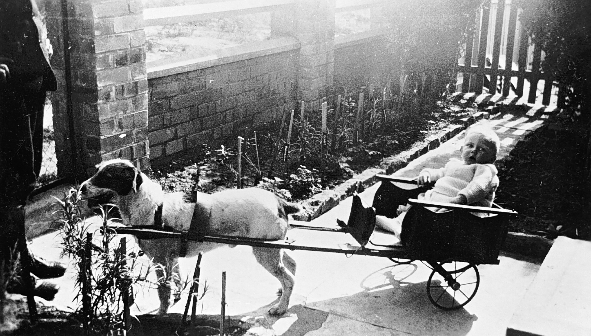 A toddler in a dog cart. They are in an enclosed garden and there is a man standing on the left.