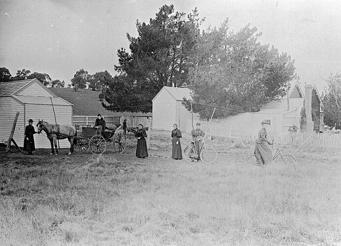 A group of women in the farmyard of 'The Firs', Beaufort. The Chinese gardener is in the background. The buggy shed is on the left and the homestead on the right.