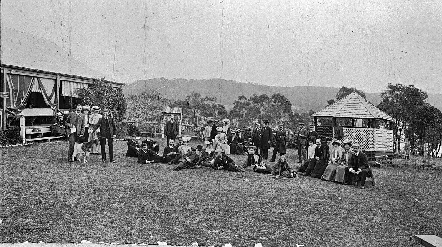 A group of people seated, and standing, on a lawn. There is a house on the left with a union jack and, possibly, a Scottish flag hanging from the verandah. There is a rotunda on the right. A man on the left is holding a goat.