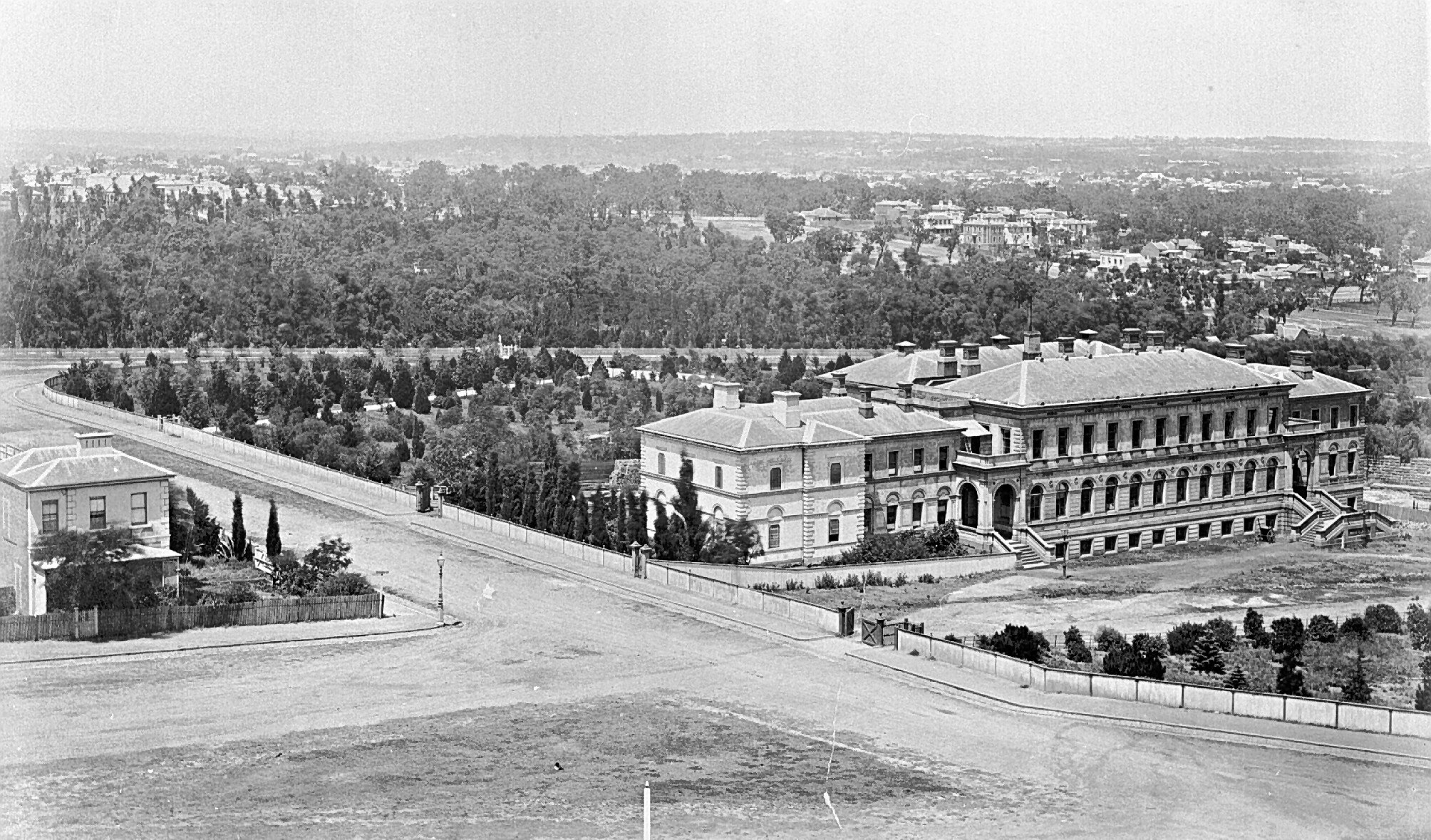 The Government Printing Offices on the right. St Andrews Place is in the foreground and the Fitzroy Gardens beyond.