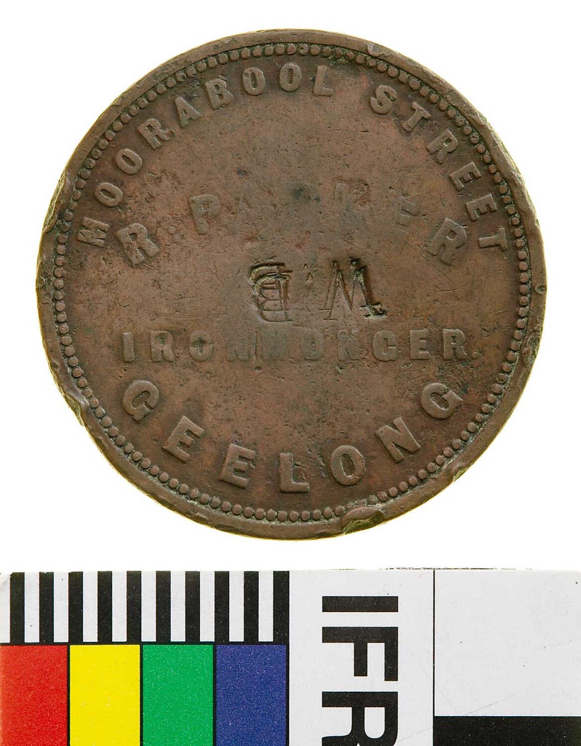 A copper token (34 mm diameter) featuring the name, address and business of the issuer: R. Parker, Moorabool St. Geelong, Ironmonger and on the reverse, a female figure representing Justice standing facing left. She wears a blindfold and extends a balanced set of scales with her right hand. With her left she holds an inverted cornucopia from which fruits flow onto the ground. She wears an ancient-style of flowing dress bound at the waist, her left arm is draped to near the elbow while drapery falls from her extended arm to below the horizon line behind; around above, AUSTRALIA. A three-masted sailing ship on horizon at left of token. Surcharged WB
