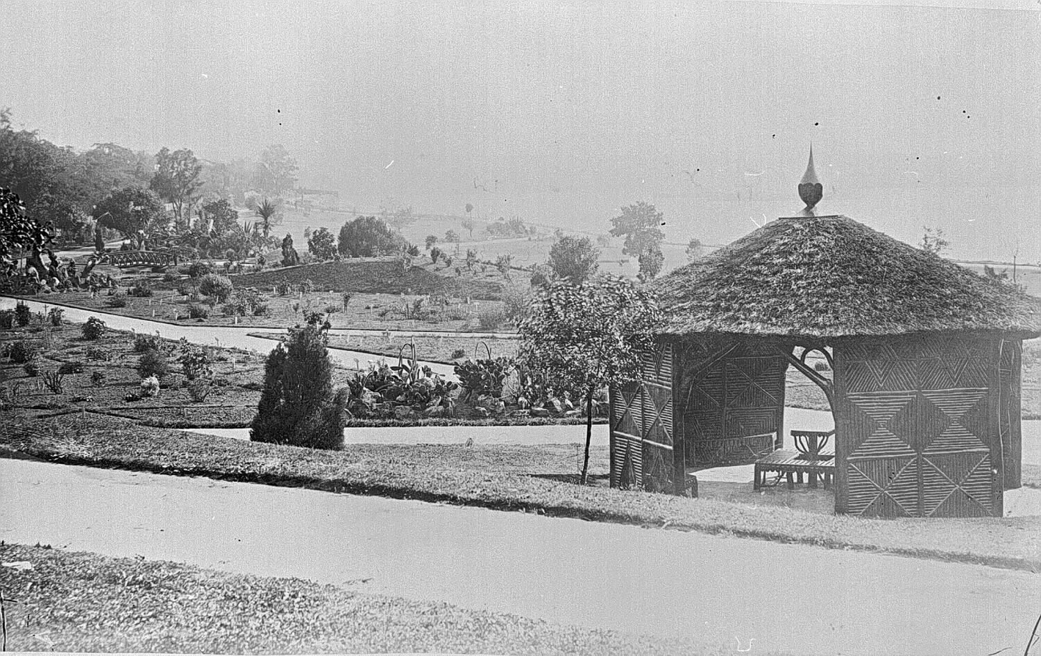 Sydney Botanic Gardens, Sydney Harbour in the distance. A shelter on the right.