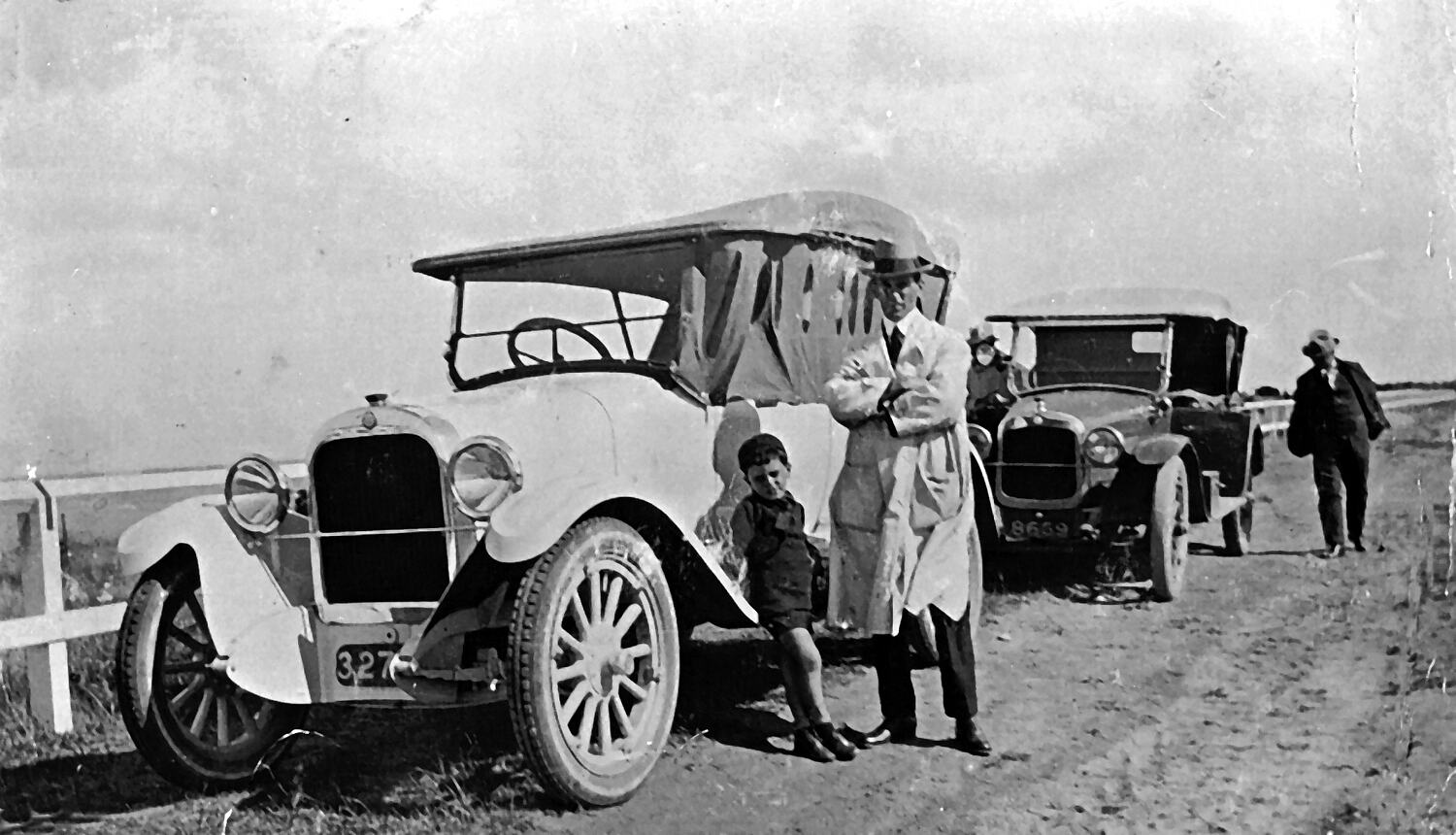 A man and boy beside a 1923 Dodge car. There is another Dodge car behind with a man walking beside it.