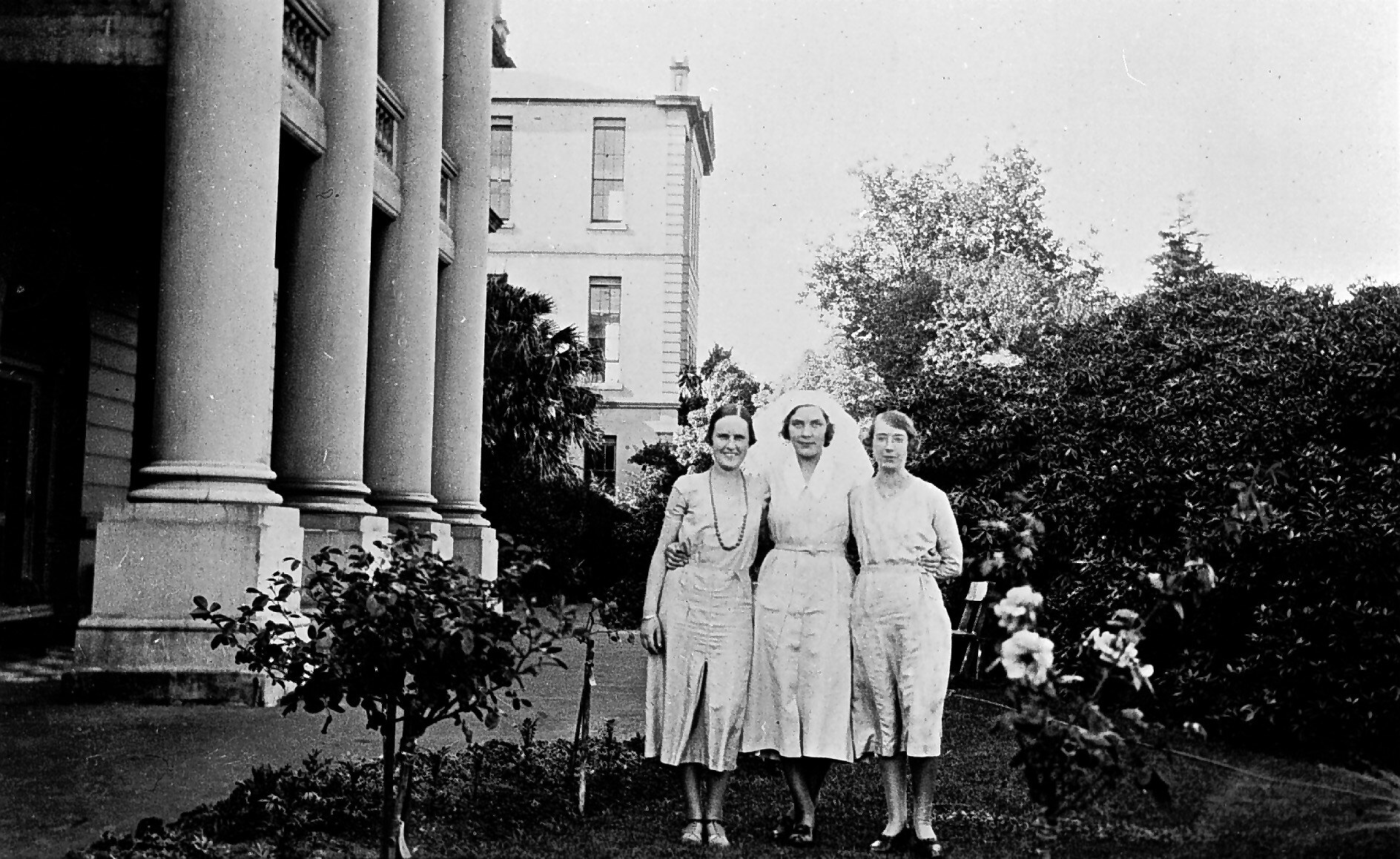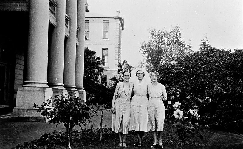 A nursing sister and two women in garden at the Ballarat Base Hospital. The rhododendron bush, planted by a Mr Ross, was well known.