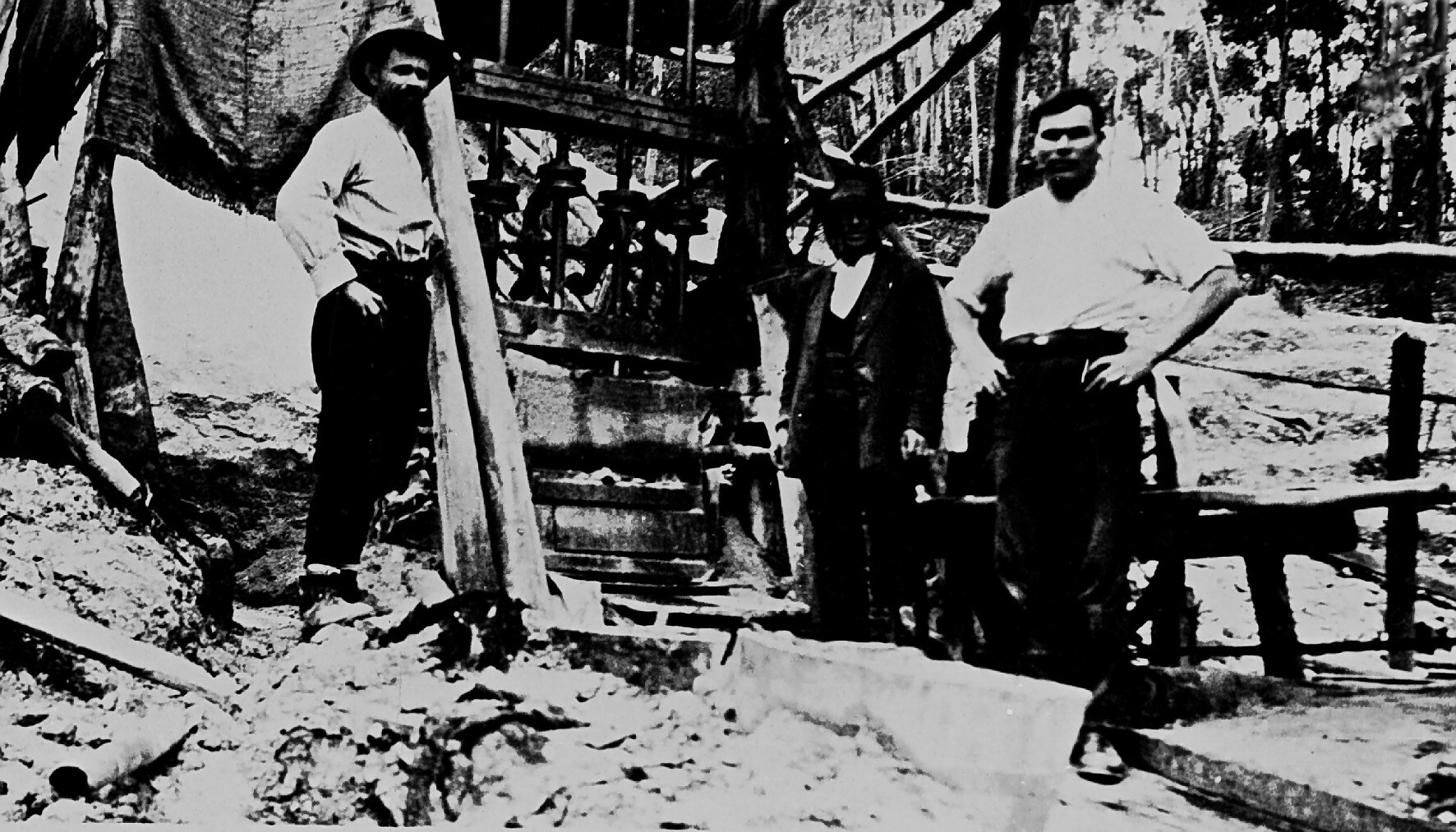 Three men at a stamp battery.