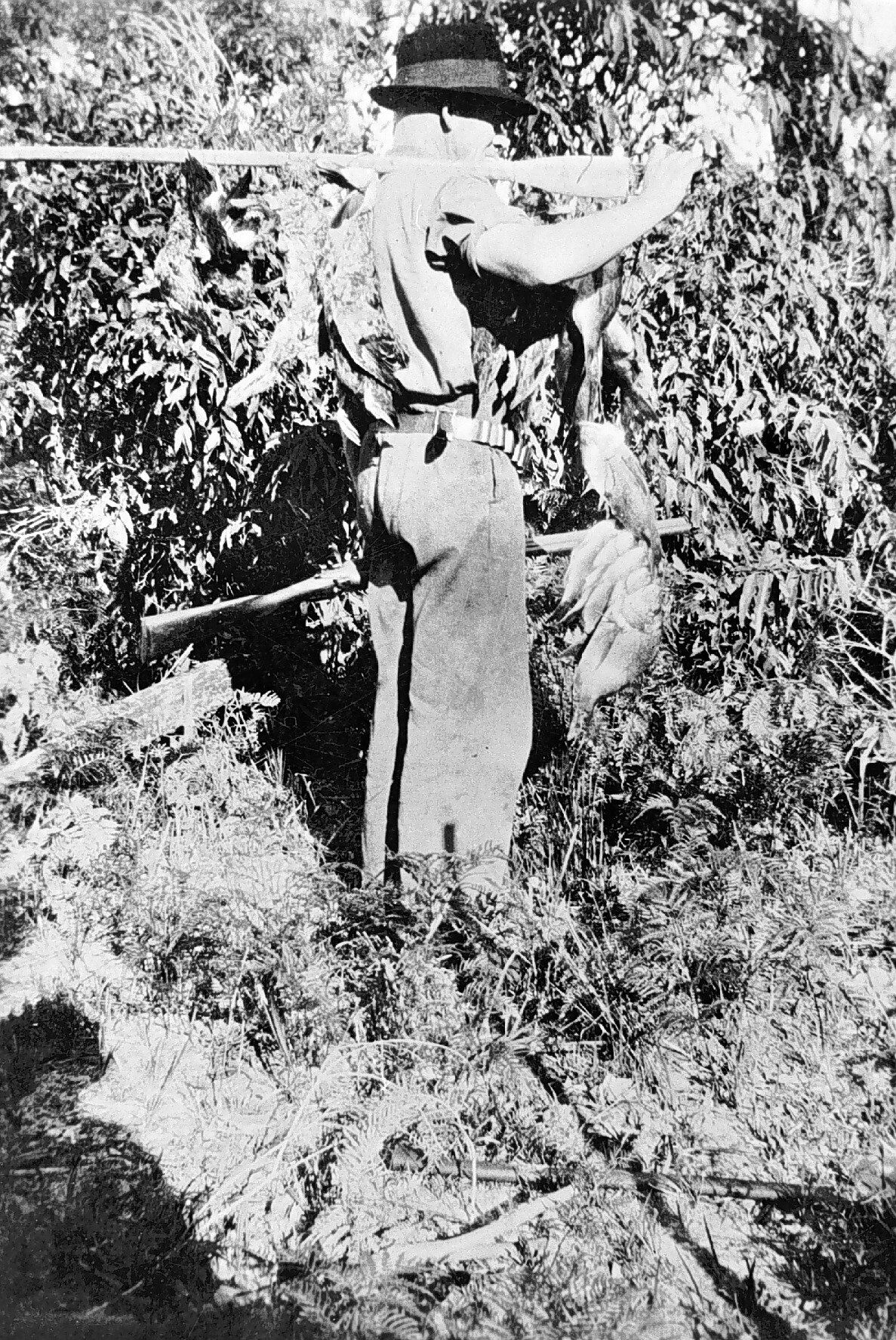 A man with a bag of ducks. He is holding an oar over one shoulder.