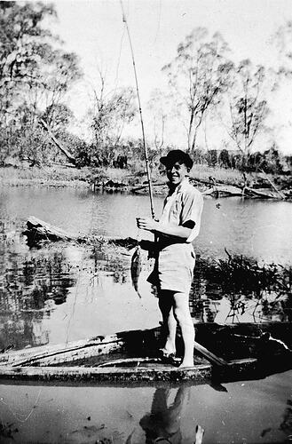 A boy with a fish. He is standing in a boat on the Loddon River.