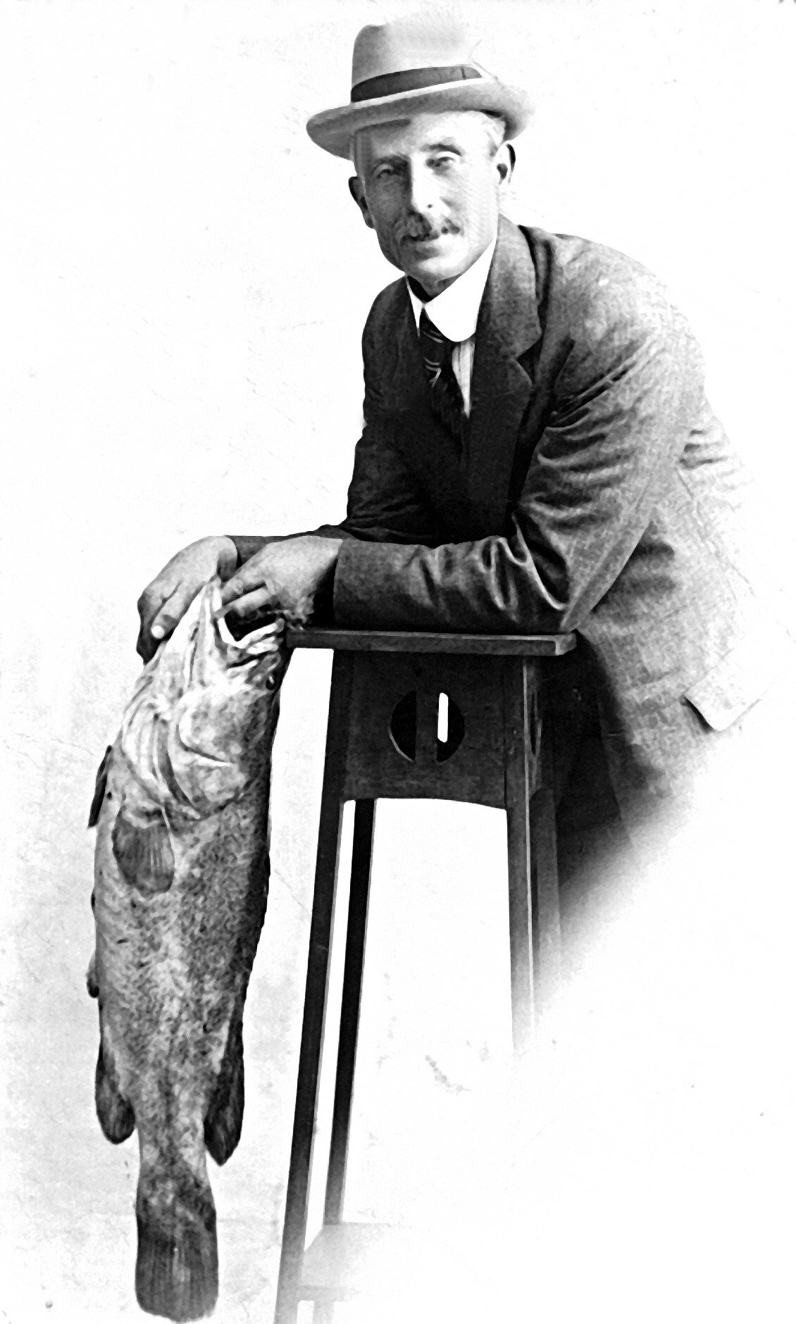A man leaning on a stool and holding a large fish (a Murray Cod?).