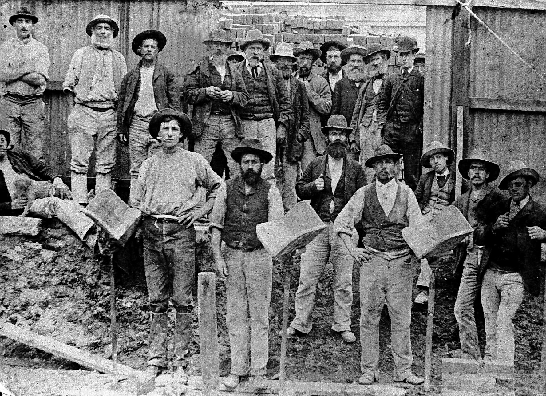 Workers on a building site. Three of the men are holding hods.