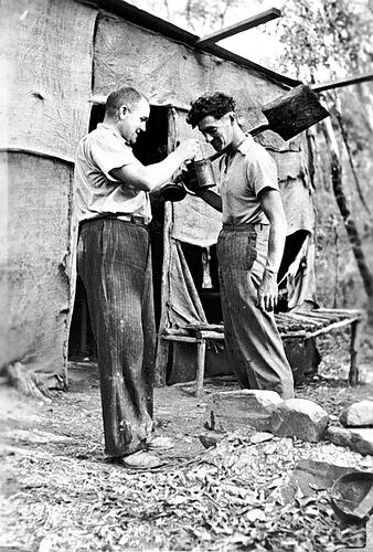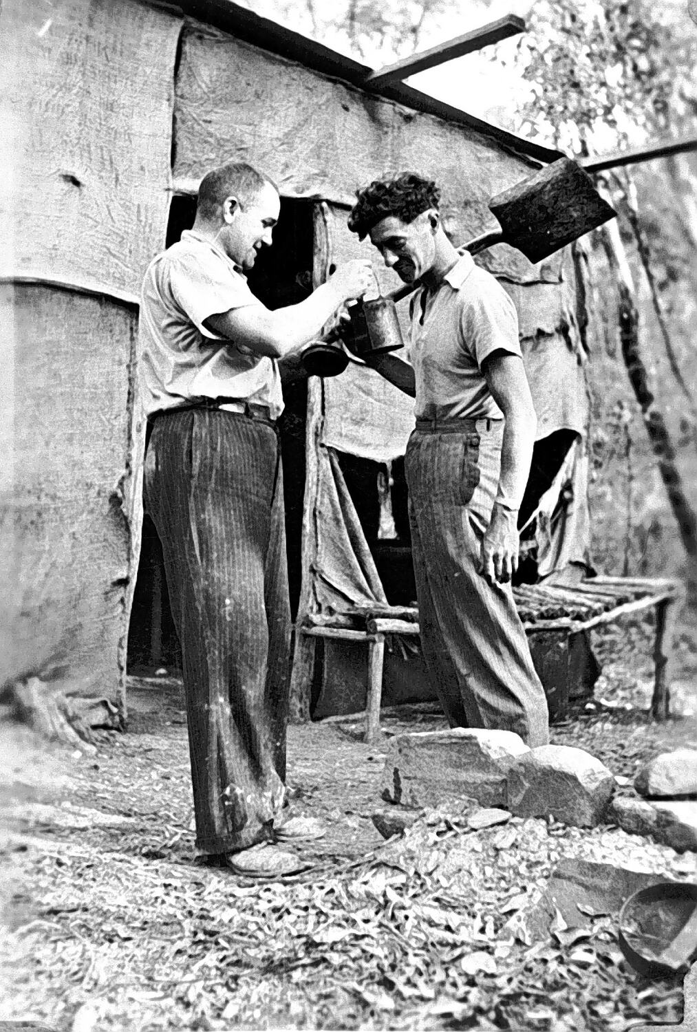 Two men in a mining camp. One holds a shovel over his shoulder and is inspecting the contents of a billy held by the other man. There is a camp bed outside the tent. The tent is made of hessian.
