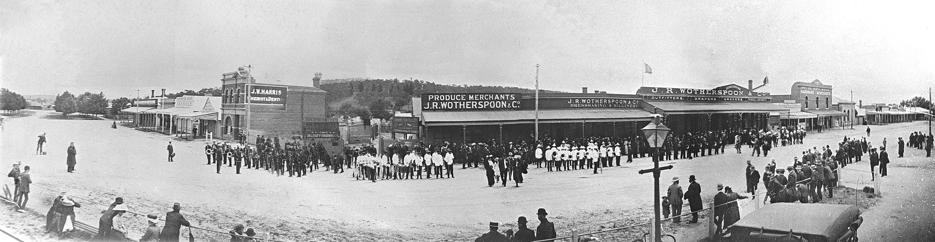 A panoramic view of the street in front of J. R. Wotherspoon, produce merchants. A number of bands competing in a competition are drawn up in front of the store.