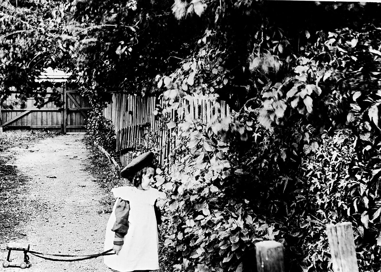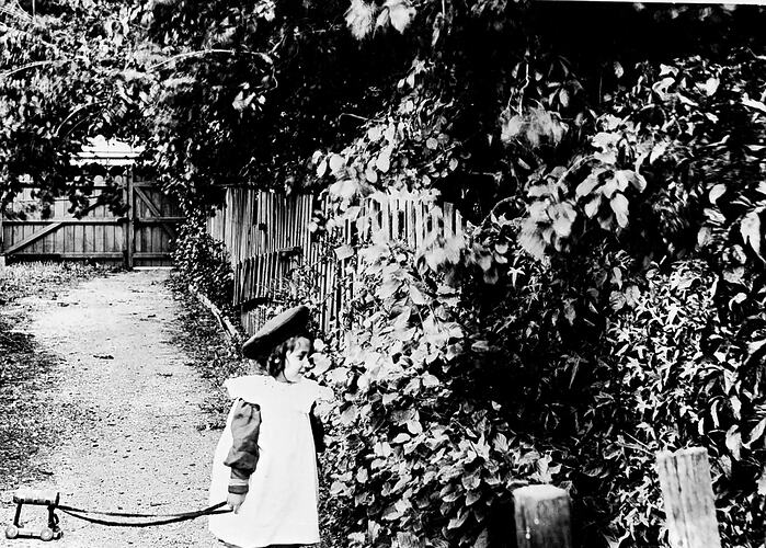 A small boy, Liddon Thomas, in a garden. He is wearing a pinafore and is pulling a toy behind him. The property was known as 'Loyetta'.