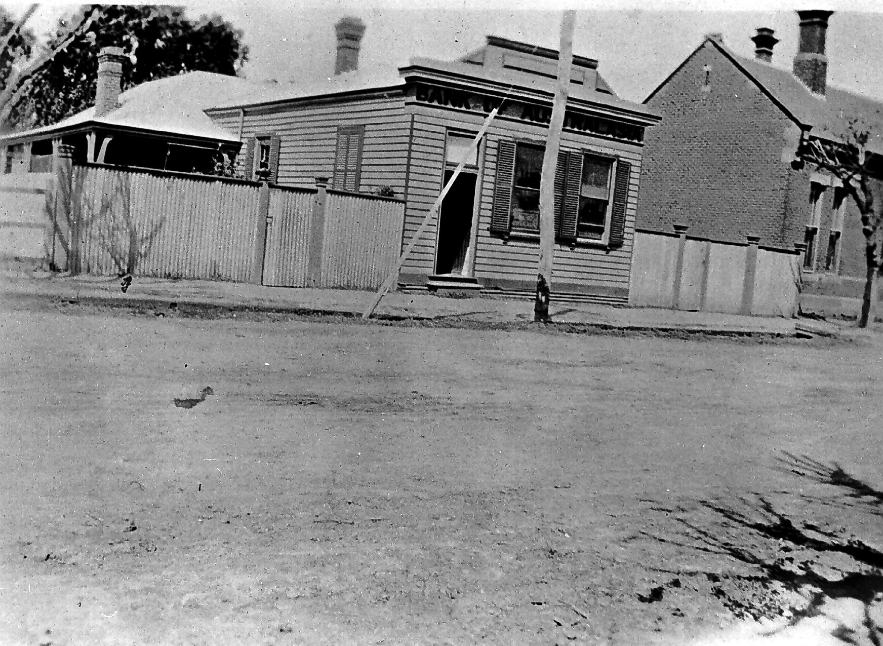 Weatherboard building with 'BANK OF AUSTRALASIA' written across top section above the doorway and windows. The bank has a semi-flat angular roof. Two large windows with wooden shutters dominate the facade and a doorway is located to the left. Corrugated iron fencing sits either side of the bank and a larger attached building with brick chimneys and verandah is set back from street. The road in front of the bank is dirt and the footpath is raised with a telegraph pole in front of the bank's entrance. A larger brick building with several chimneys can be partially seen to the right.