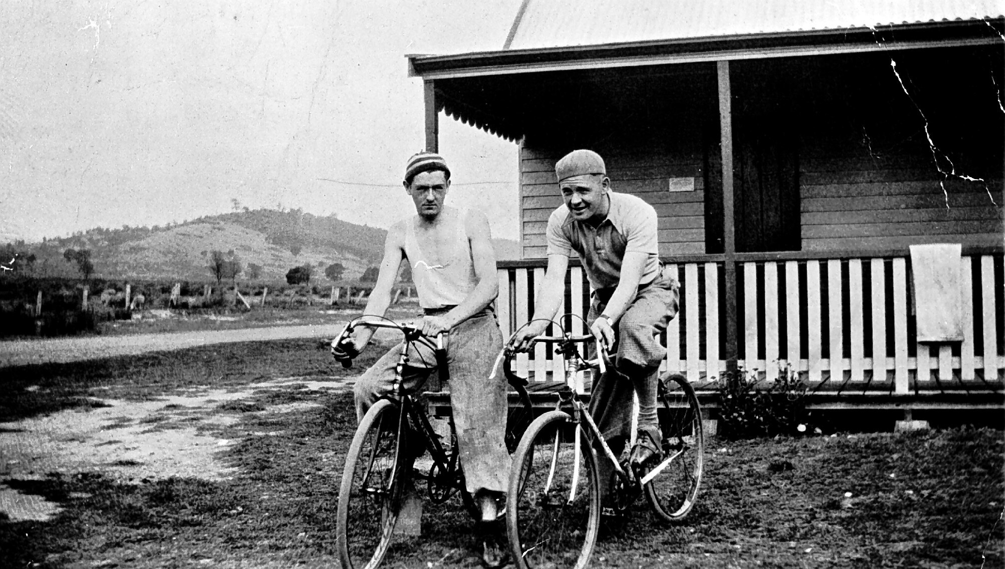 Two men on bicycles outside the Glenburn Hotel and Post Office. Both men wear plus fours. Hanging over the rail behind them are a pair of 'Oxford bags' - very wide legged trousers, fashionable at the time.