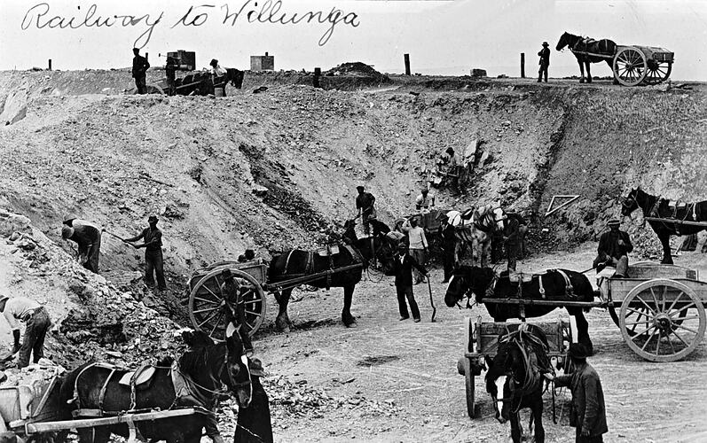 Men with horse and carts excavating for the railway to Willunga.