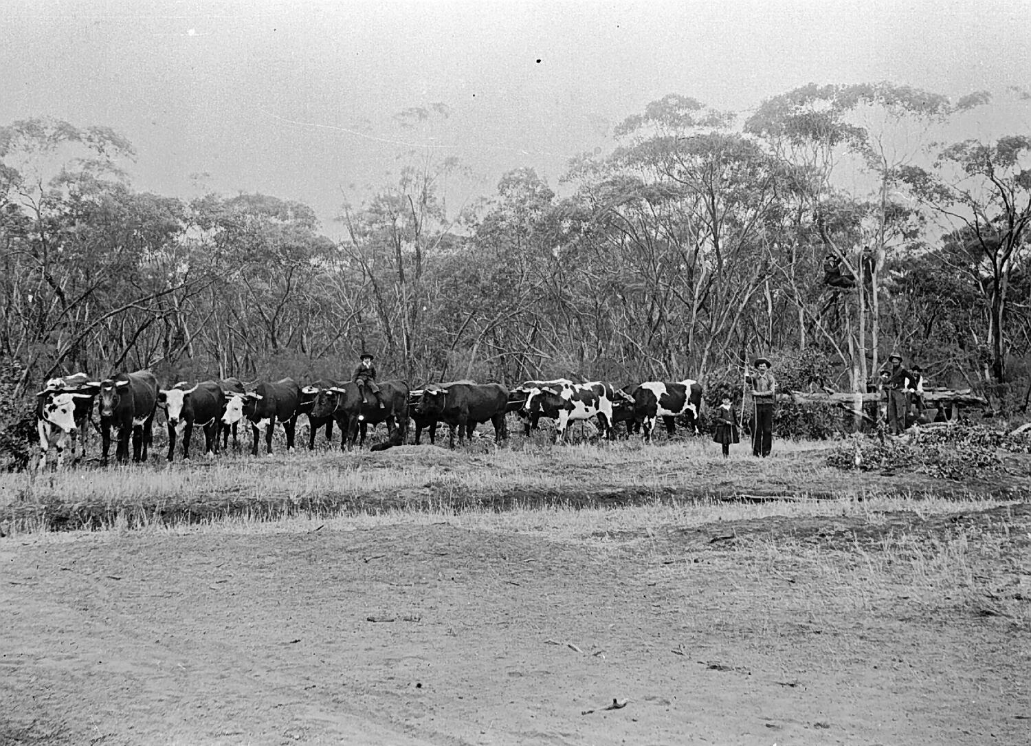 A team of bullocks and a Mallee roller on the Lascelles to Nyallo road. Three children accompany the adults.