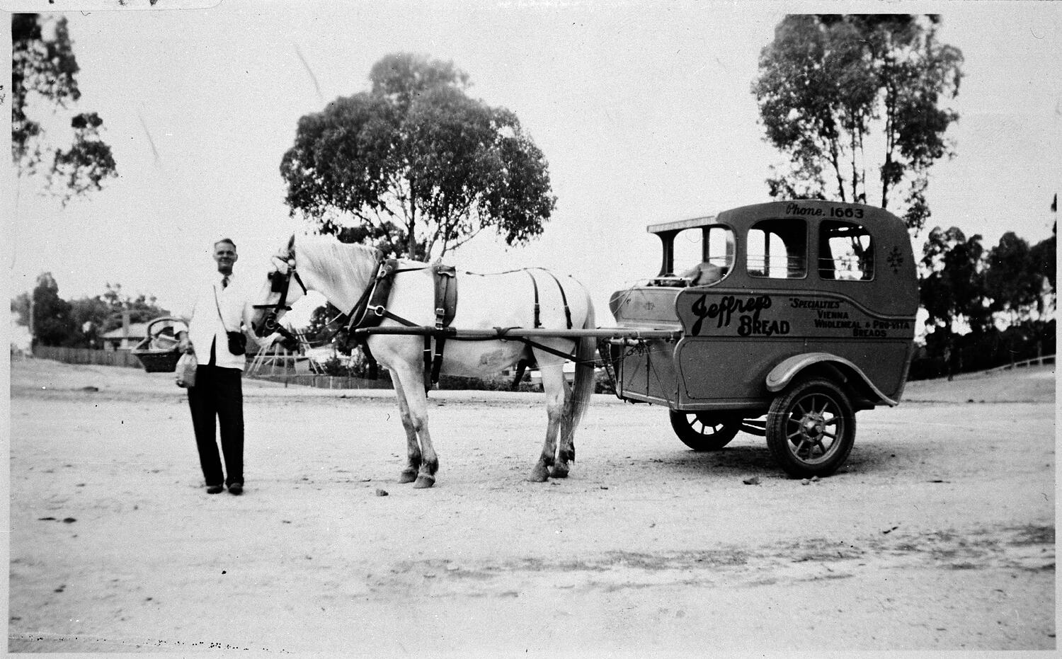 A baker with a baker 's cart advertising Jeffrey's Bread. The cart looks to have been constructed from a car body.