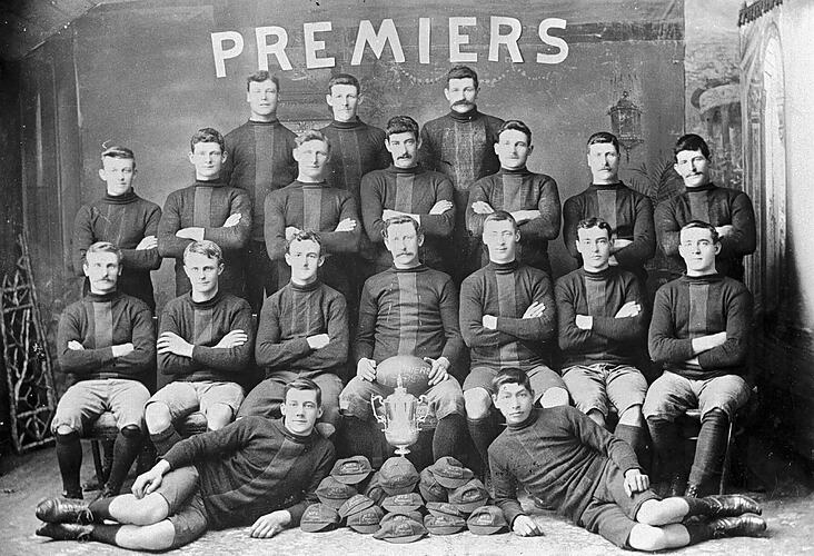 Warracknabeal Football Team, premiers in 1909. The premiership cup is in front of the group surrounded by the team members ' caps.