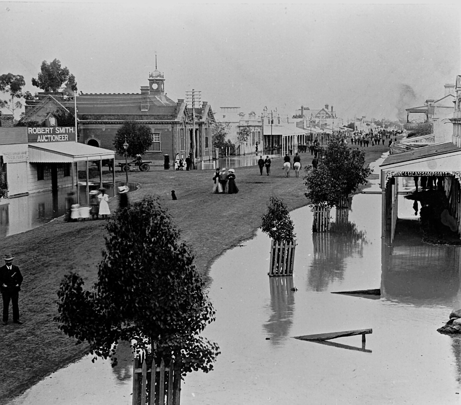 A flooded street in Warracknabeal. The Commercial Hotel in the background on the right while the premises of Robert Smith, auctioneer are across the street.