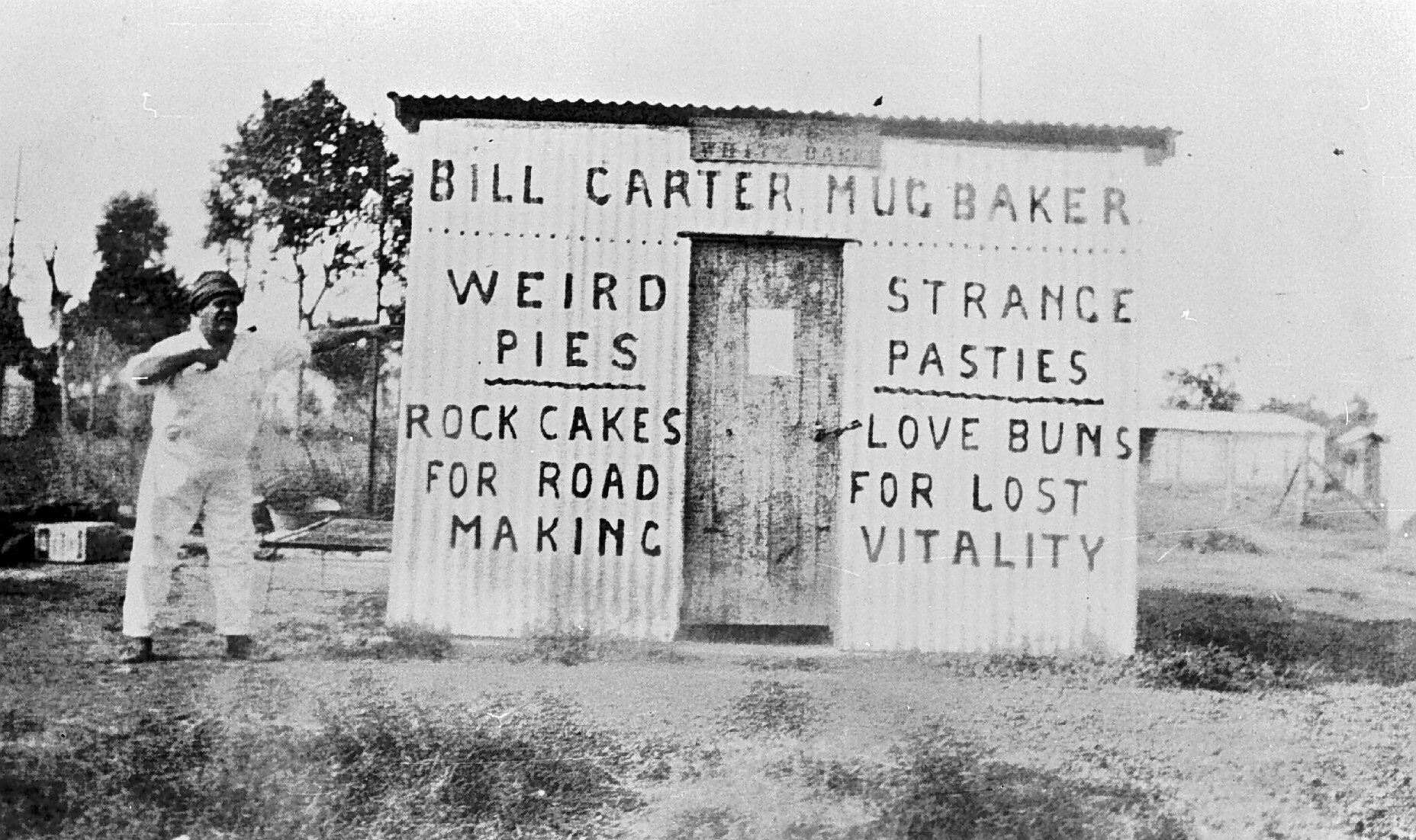 Bill Carter - 'mug baker', standing by his shop which is painted with the slogans: weird pies, strange pasties, rock cakes for road making, love buns for lost vitality.