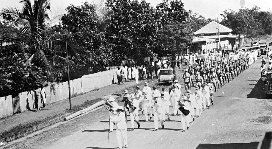 The Darwin Civilian Band and the Darwin Army Garrison marching, possibly in the Armistice Day ceremonies.