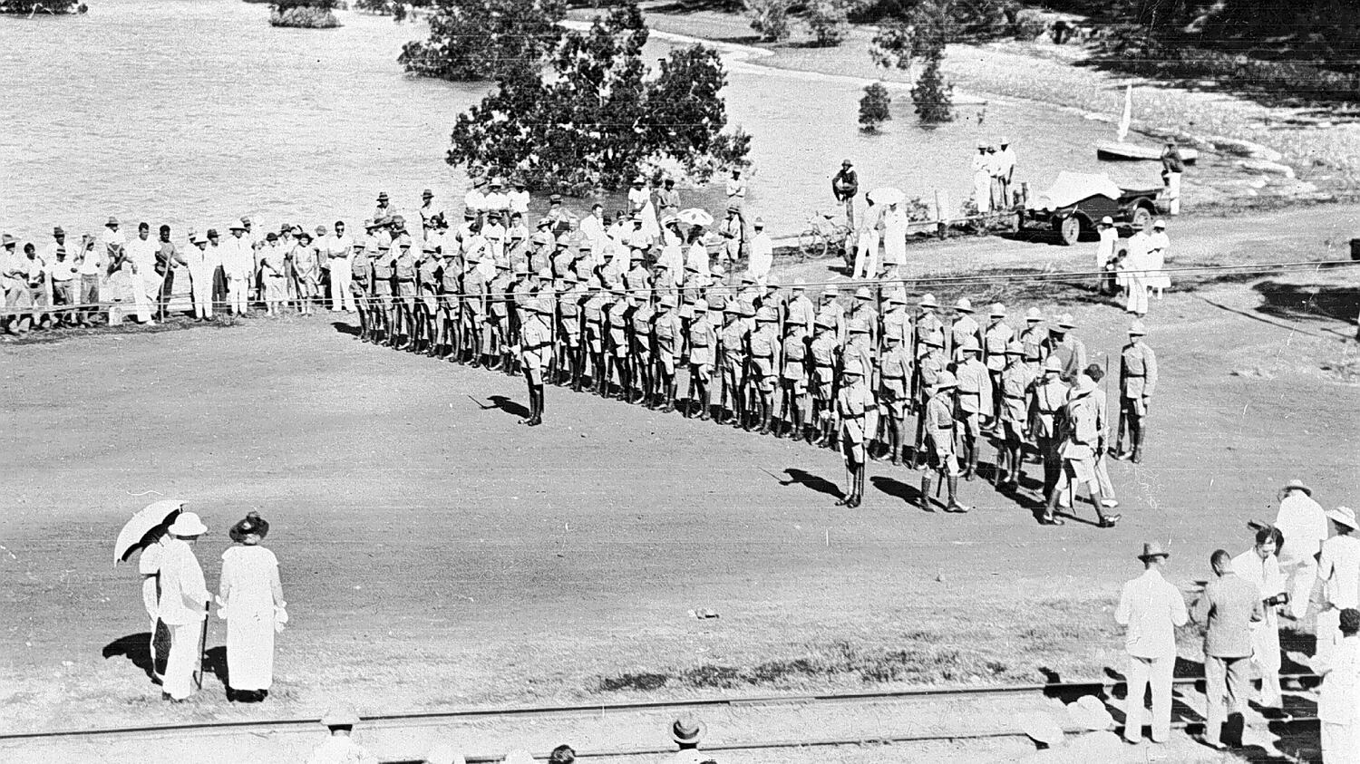 The Darwin Garrison parading for the Governor General, Lord Gowrie, on Anzac Day. The Darwin Harbour is in the background.