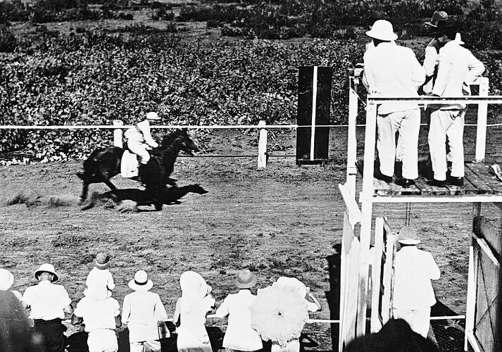 The winning post at the annual races at Darwin Racecourse. Captain Secombe on 'Bushman', is winning the hack race. The judge 's box is on the right.