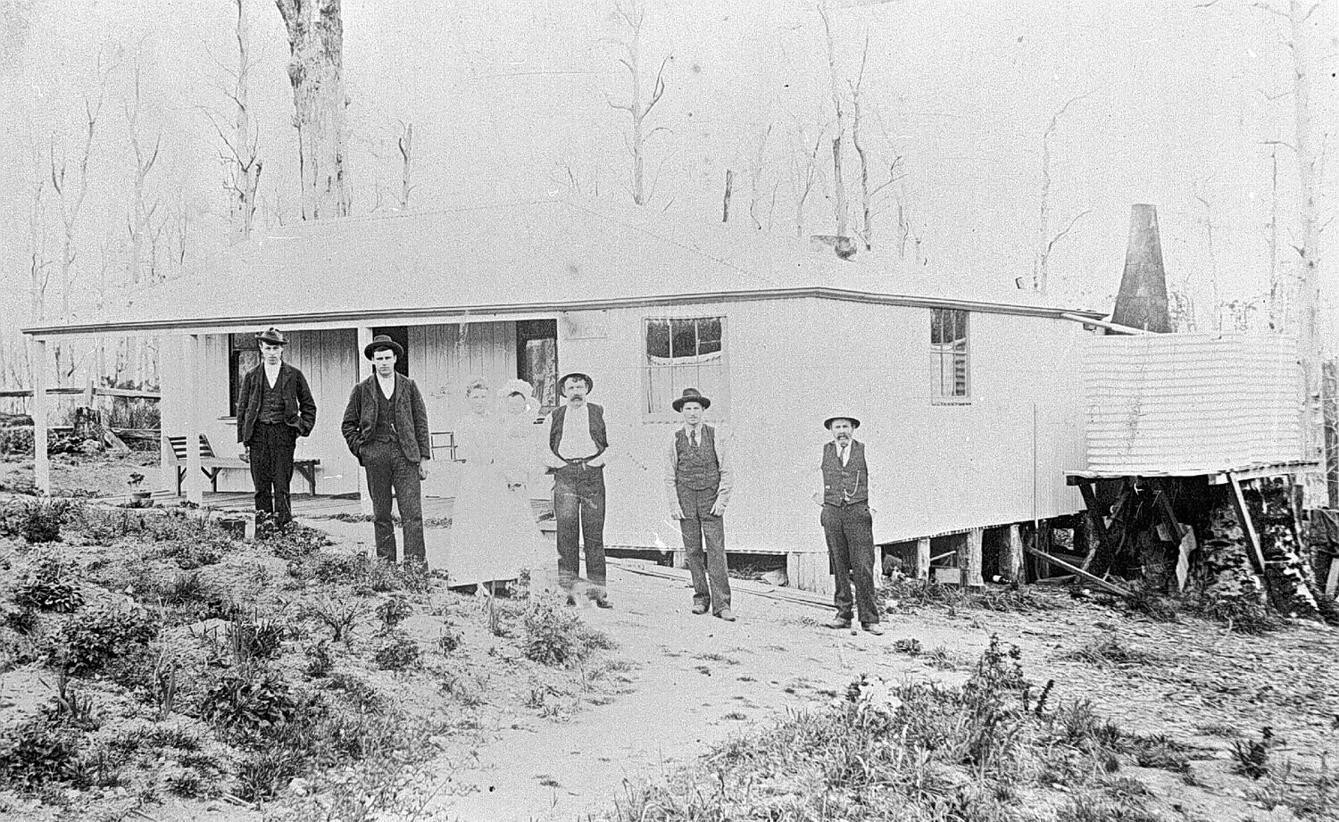 A group of five men and a woman holding a baby standing outside a wooden house. There is a water tank at the side of the house and the garden is unmade.