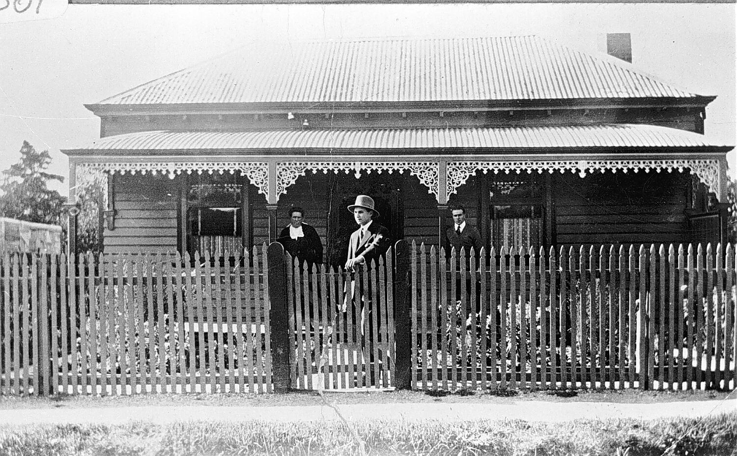 A man at the gate to a small wooden house. There is another man and a woman on the verandah which has iron lacework.