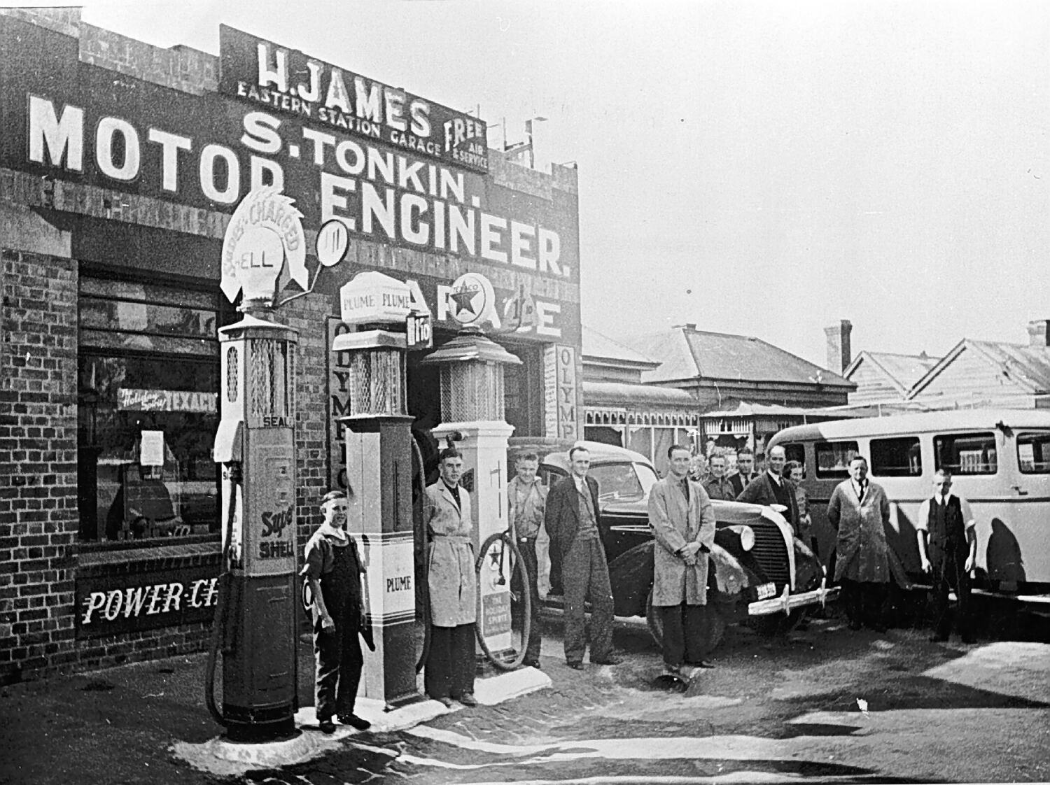 Staff outside H. James Eastern Station Garage. There are petrol pumps for Plume, Shell and Texaco. There is a car and a bus in the background.
