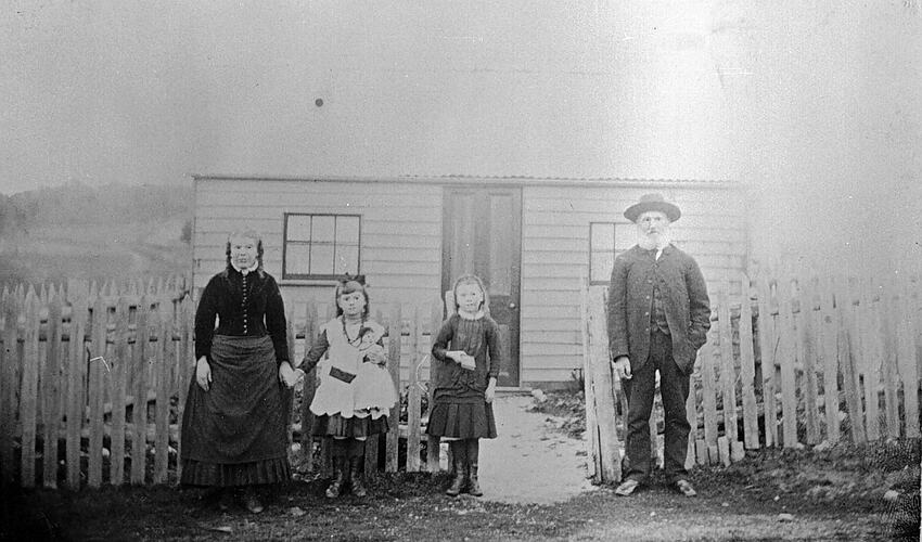 A man and woman and two small girls outside a small wooden house.