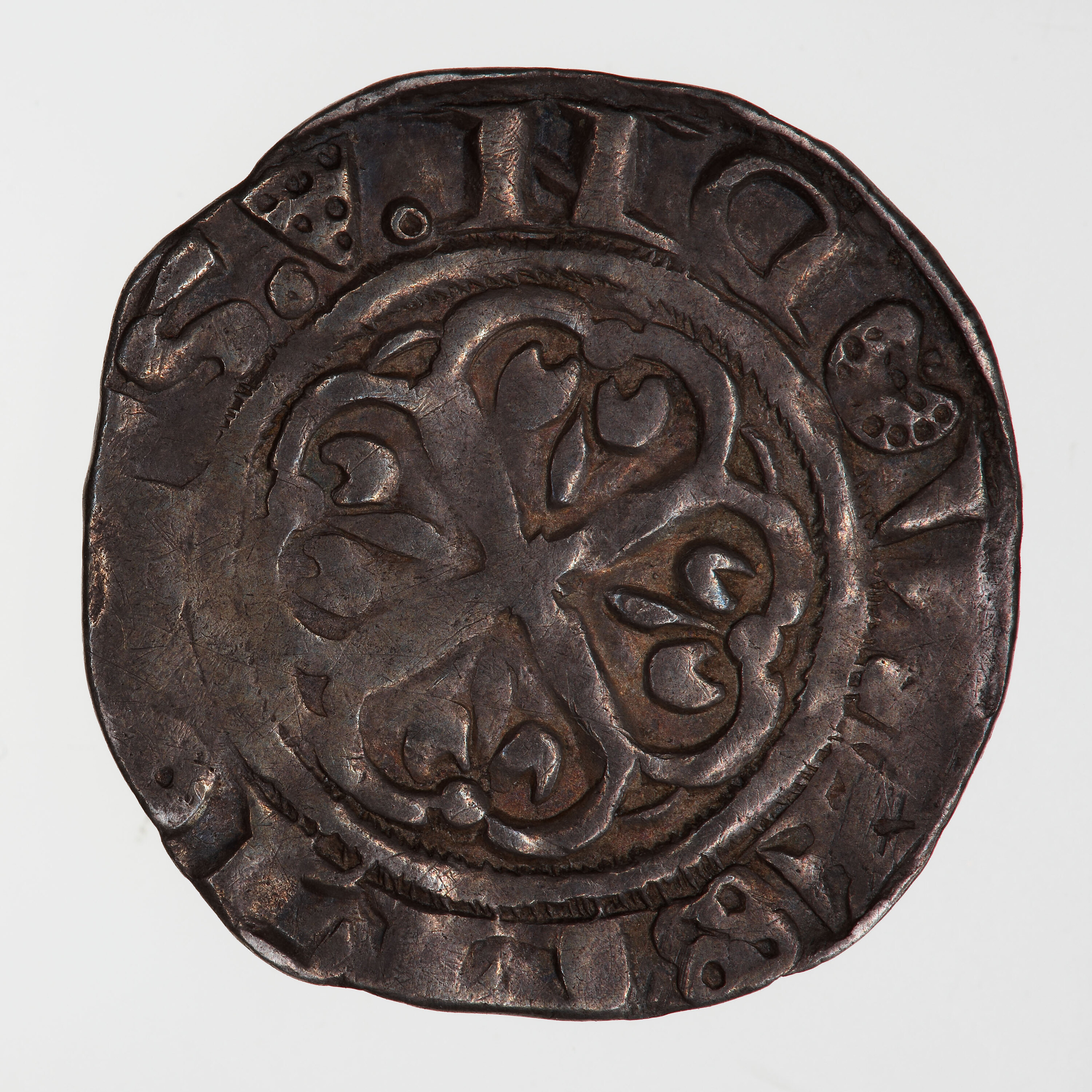 At the centre within a line circle a cross moline with a fleur-de-lis in each angle; around, + PTIECSNEV
