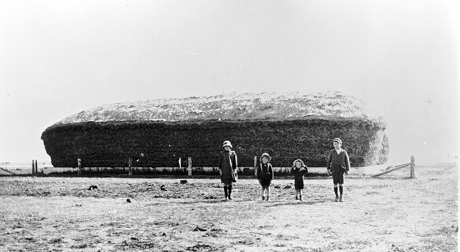 Four children standing in front of a haystack which has a corrugated iron mouse guard.