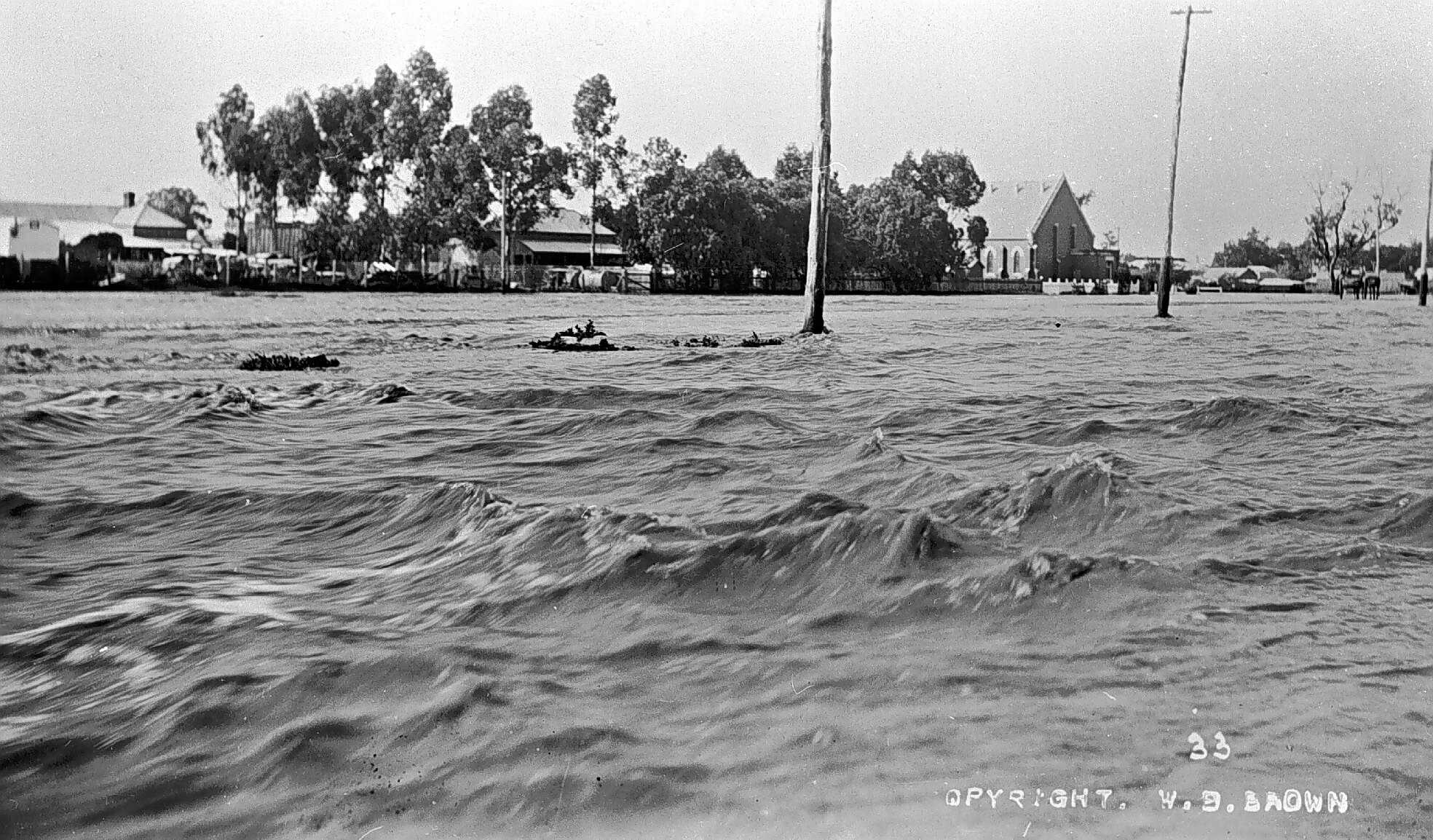 Rochester streets under floodwater. The Presbyterian Church is in the background,.