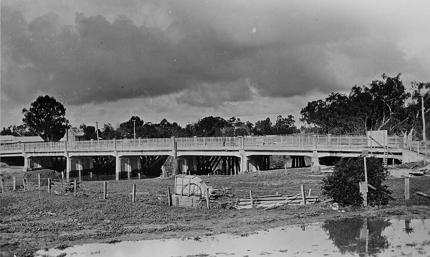 The new bridge over the Campaspe River. There is an unidentified piece of farm machinery in a paddock beside the bridge.
