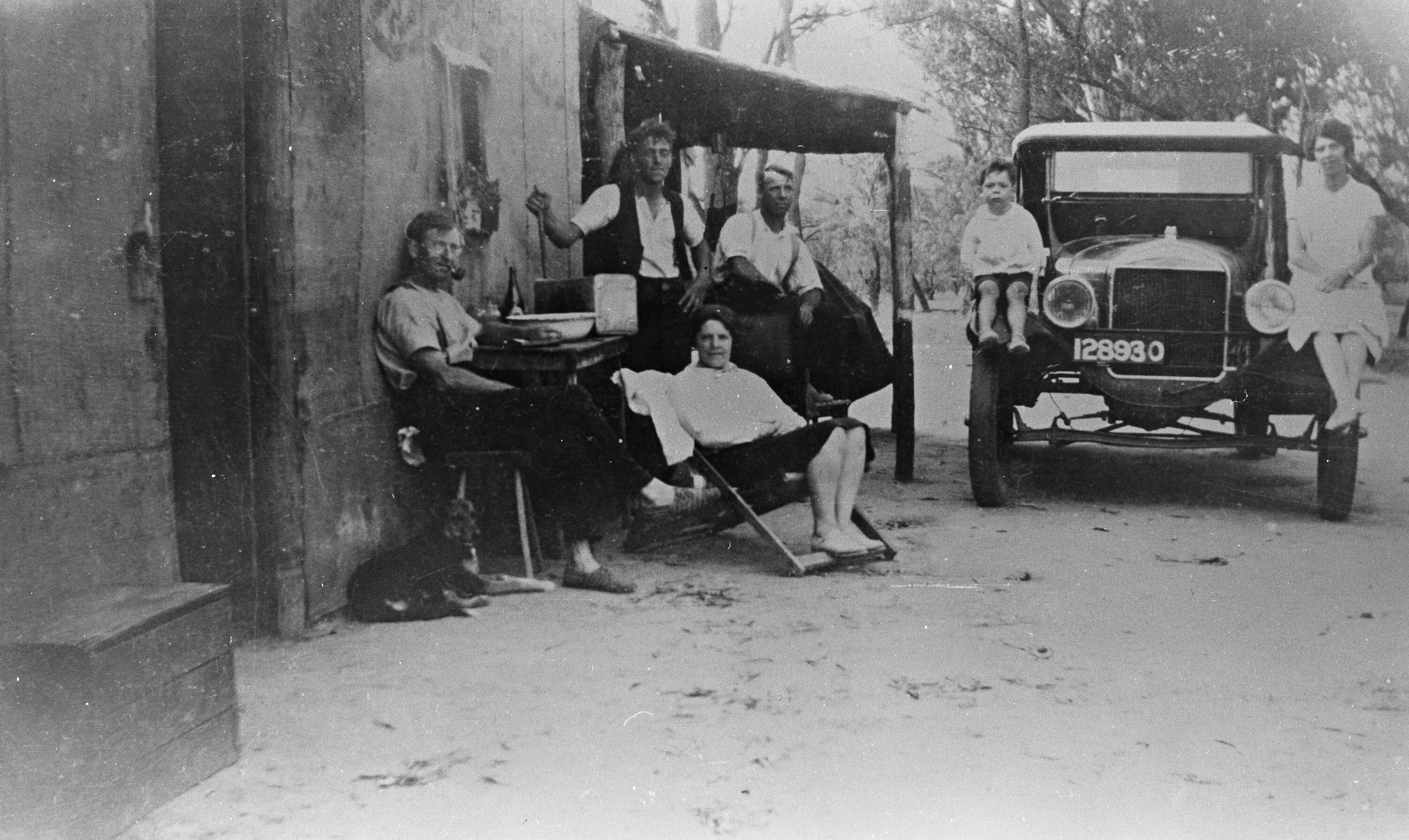 A group of people outside a hessian and bark hut belonging to a Murray River fisherman. Model T Ford motor car at right.