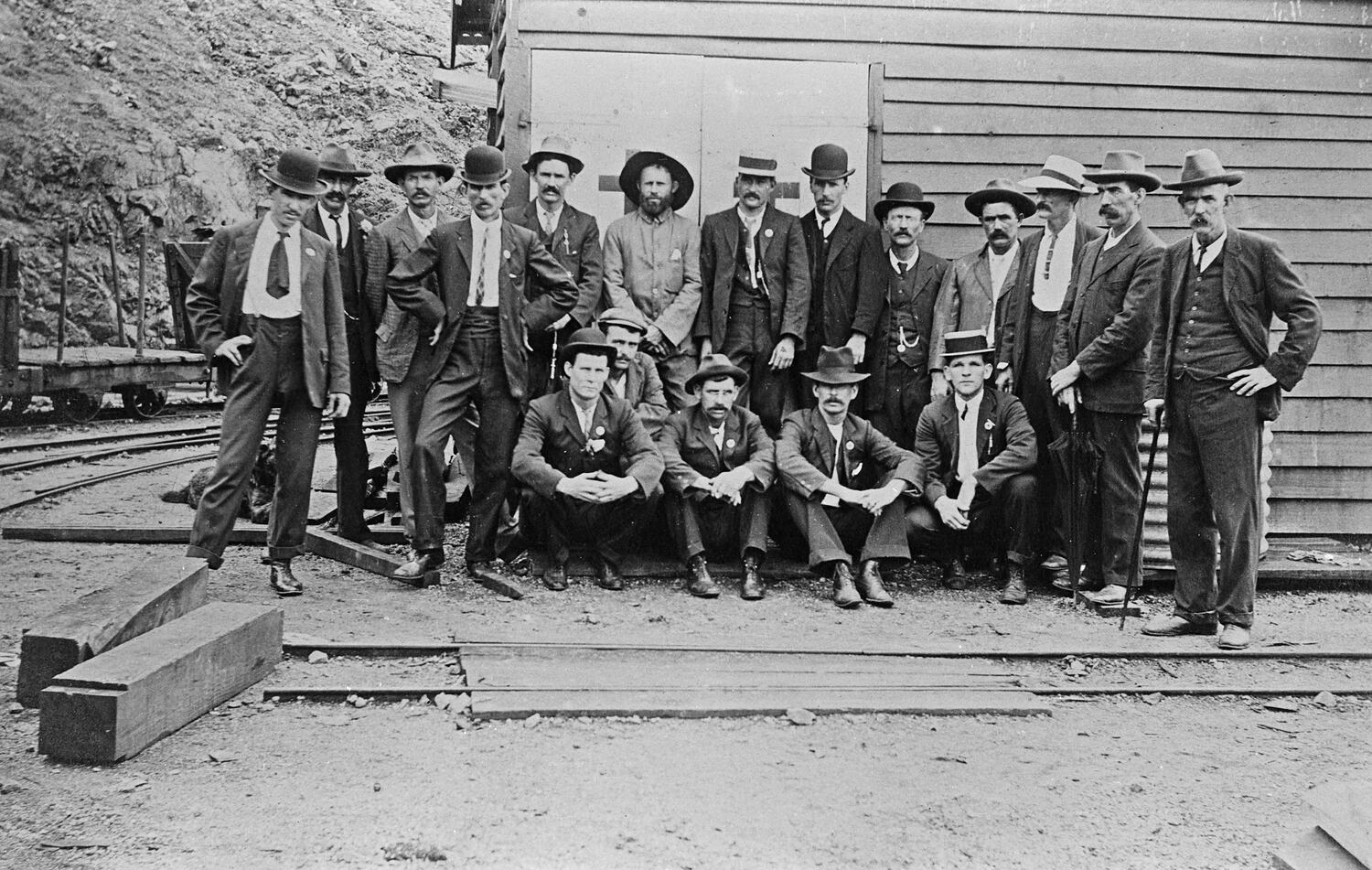 A group of men outside a building of the Mt Morgan Mine. They are all dressed in suits and are wearing hats and ties.